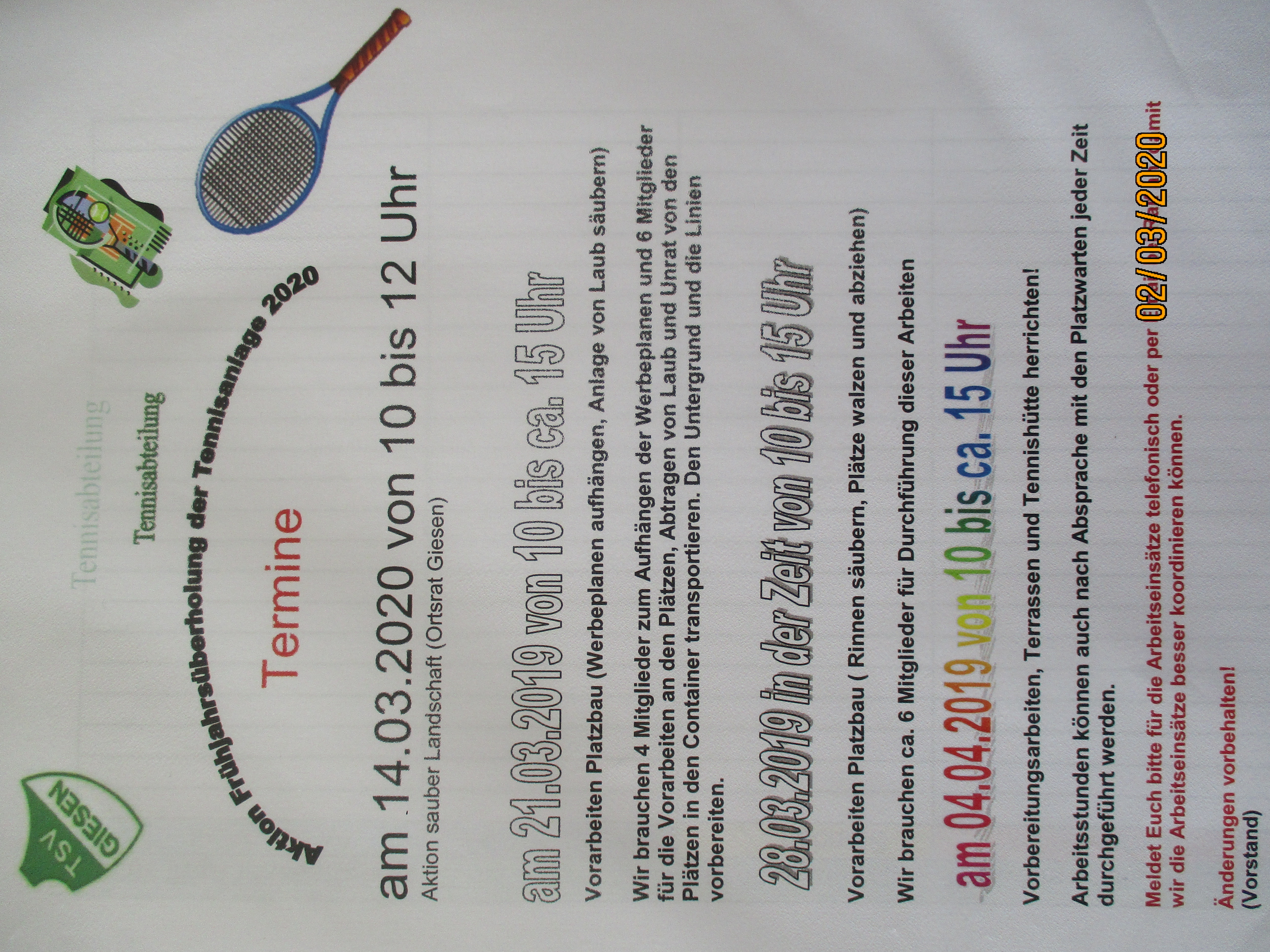 Liebe Tennisfreunde in einigen Tage beginnen wir wieder mit der Vorbereitung und Frühjahrsüberholung unserer schönen Tennisanlage.Die Frühjahrsüberholung der Sandplätze wird von der Firma Fiedler durchgeführt.Im Anhang findet Ihr die angesetzte Termine im Infoblatt! Ich bitte alle Mitglieder an den Aktonstagen teilzunehmen.Der Vorstand.