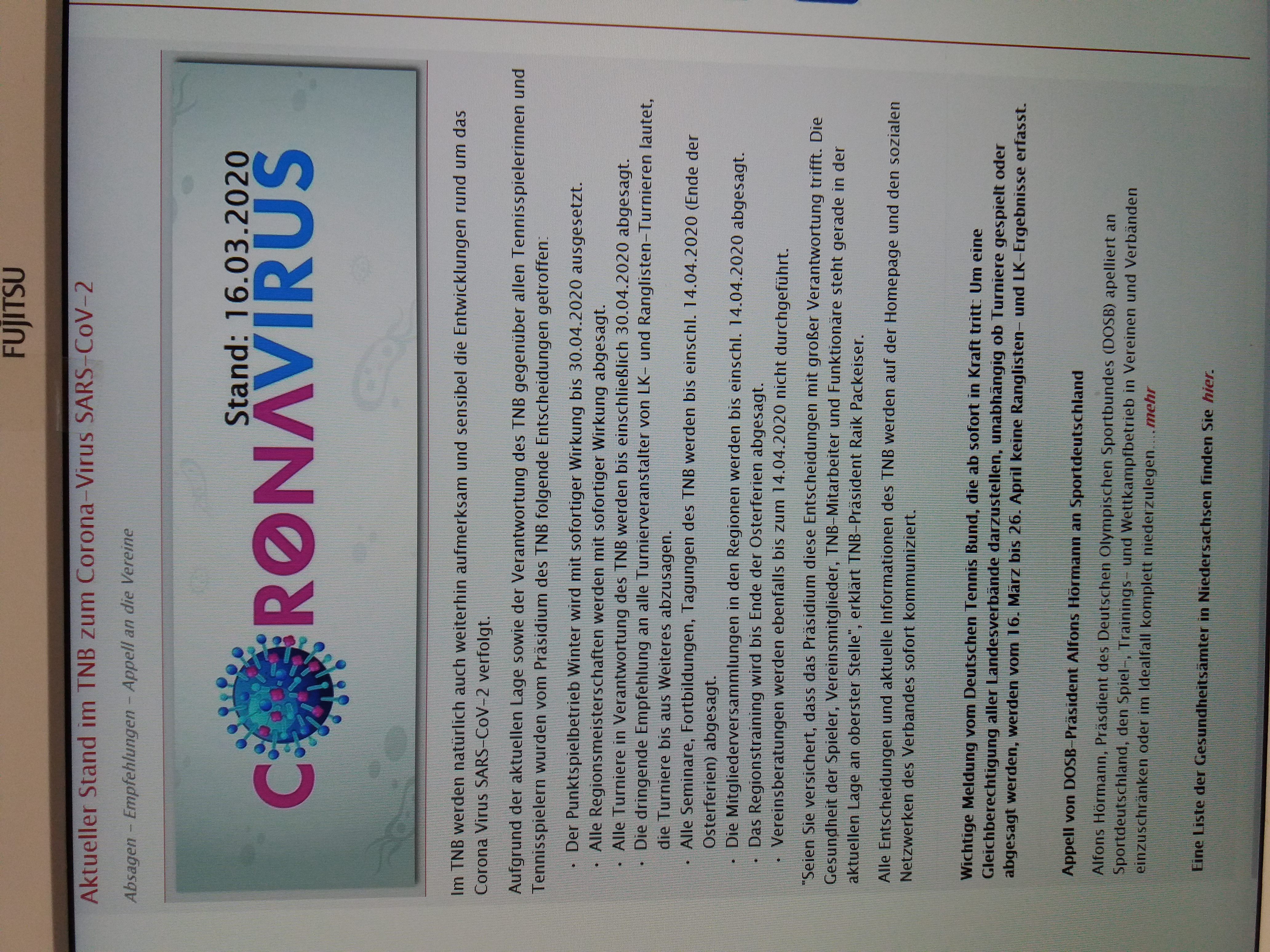 Liebe Tennisfreunde! Im Anhang eine Information vom TNB zur aktuellen Lage und Entwicklung zum Corona-Virus! Sportlich Grüße Ralf