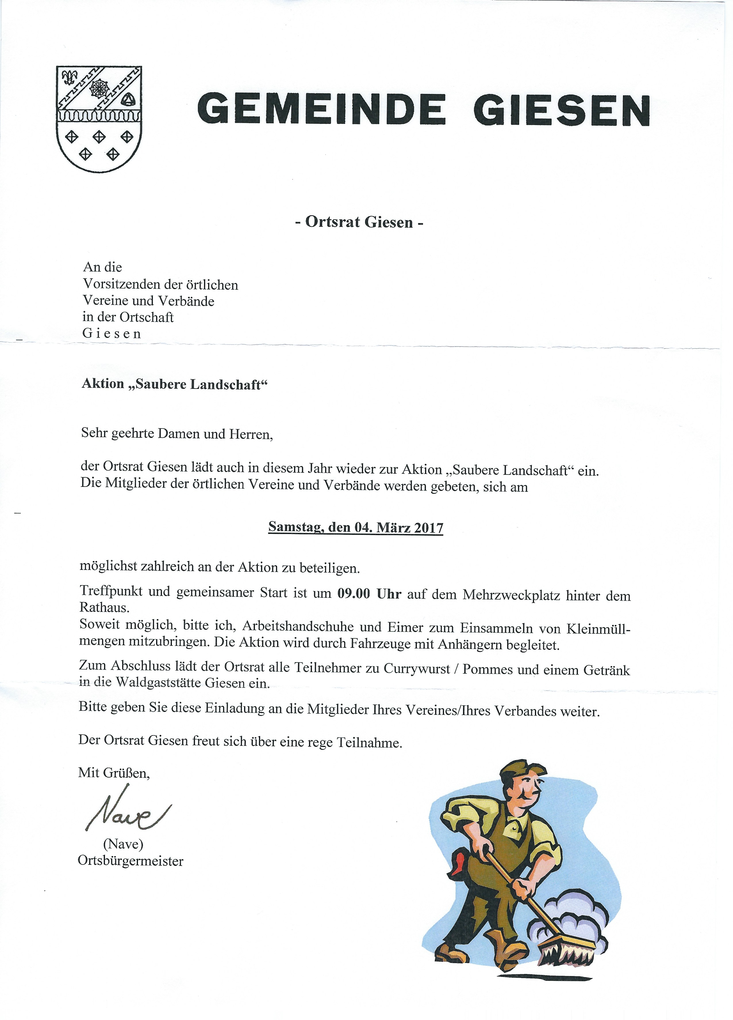Liebe Tennisfrunde, der Ortsrat Giesen lädt wieder zur alljährlichen Aktion ,, Saubere Landschaft ,, ein.